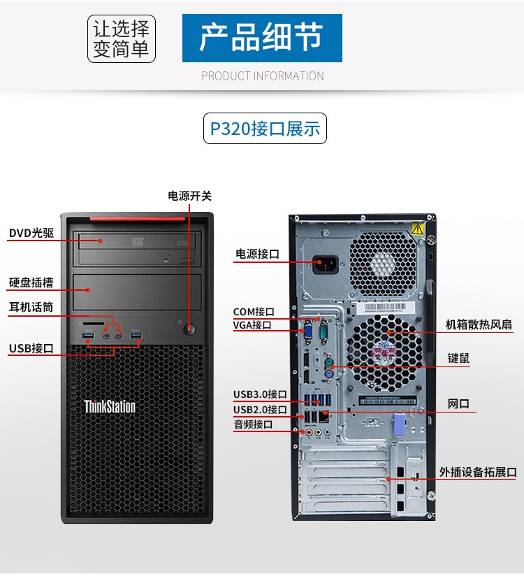 联想(ThinkStation)P330图形工作站 (I7-9700K/32G/256GB+1TB/P4000/键鼠 )